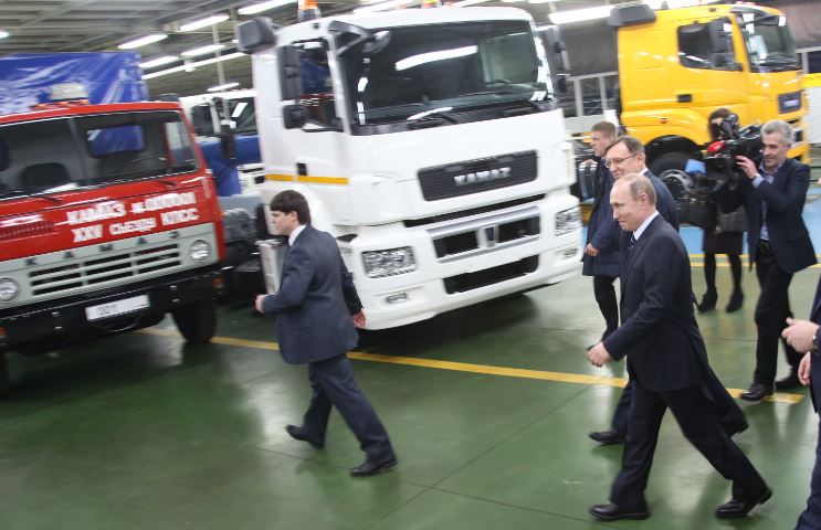 [Photo at top of KAMAZ trucks on display at the Naberezhnye Chelny industrial site in Tatarstan.]