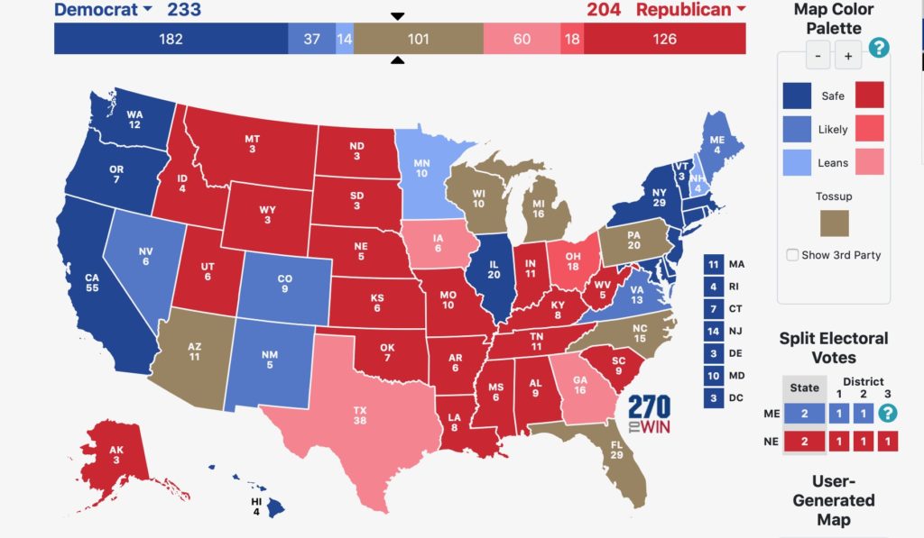 If the election were held this week, polls show that Biden would garner at least 233 Electoral College votes. But as I stated at the beginning of this game, to win, one has to reach the magic number of 270.