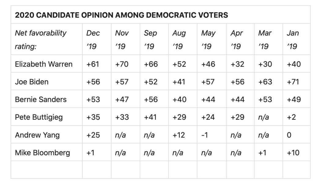 Democrats and Democratic-leaning voters continue to be divided over who they want to put up against Trump in 2020. The top contenders continue to be Biden (26%), Sanders (21%), and Warren (17%). However, these three are in a slightly different order than where they stood last month (23% Biden, 23% Warren, and 20% Sanders) or in late September (28% Warren, 25% Biden, and 15% Sanders). Buttigieg is the preferred choice of 8% of Democratic-identifying voters (similar to 9% in November and 5% in September).