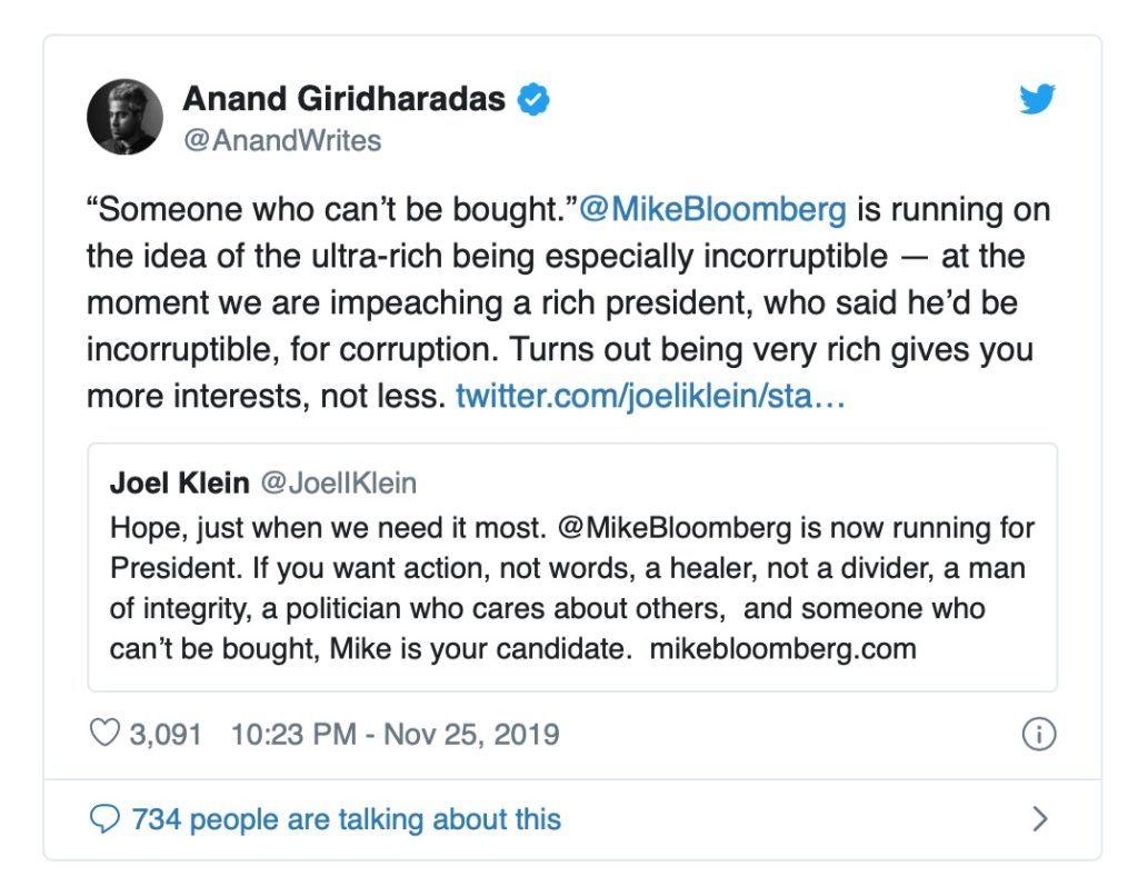 Writer and former New York Times columnist Anand Giridharadas pointed out that Bloomberg’s pitch to the American people, that his wealth makes him incorruptible and therefore more trustworthy, was illogical, given that the Democratic Party is currently attempting to impeach a billionaire president on corruption charges, arguing that “being very rich gives you more interests, not less.” It is for this reason that Elizabeth Warren has accused him of trying to essentially “buy the nomination.”