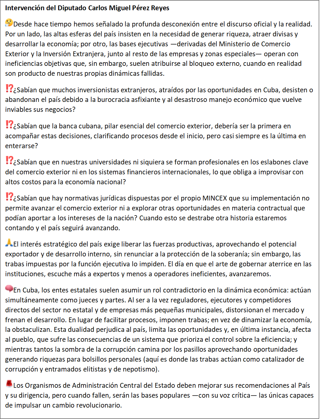 “Un parlamento solo cumple su función si quienes lo componen ejercen su papel de representar a la ciudadanía que los eligió —o en el caso cubano, ratificó— para su puesto. Y esto se hace exigiendo información, confrontando aquellas políticas y discursos —no solo las externas— que dañan hoy a ese «pueblo», y proponiendo las reformas necesarias para aliviar su vida cotidiana. Mientras no lo haga, no pasará de un simulacro, tan poco útil para la ciudadanía como el que hoy pulula en muchas democracias liberales, solo que más monótono y menos emocionante.”
