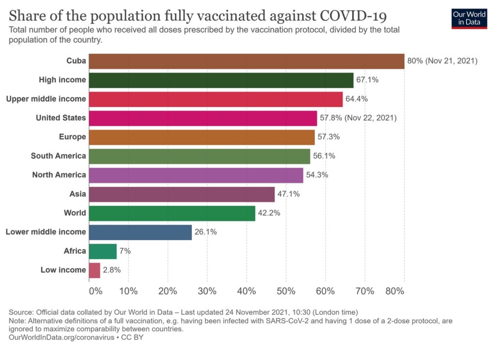 Moreover, “the country reopened its borders on November 15 to tourism, roughly a tenth of its economy, and has reopened schools,” Marcetic noted. “This makes Cuba an outlier among low-income countries, which have vaccinated only 2.8% of their combined populations.”