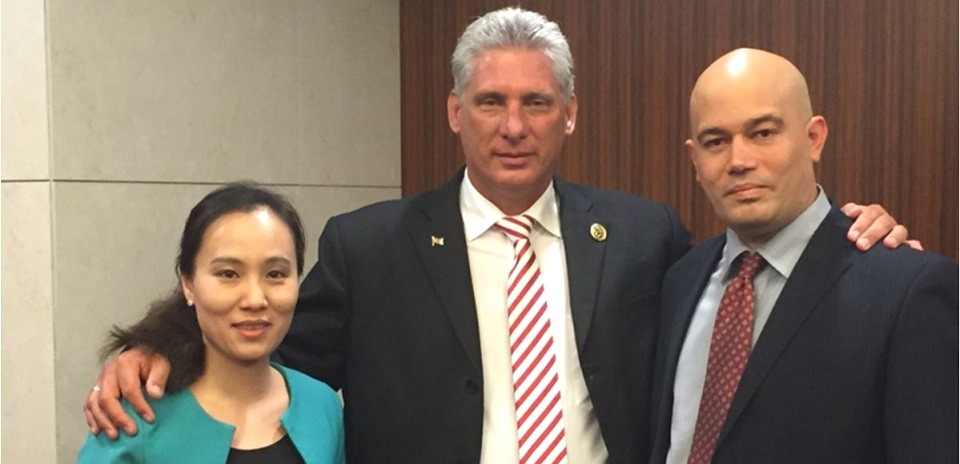 [Photo at top shows Miguel Díaz-Canel and the journalists from People Online, Liu Xuxia (at left) and Yasef Ananda Calderón.]