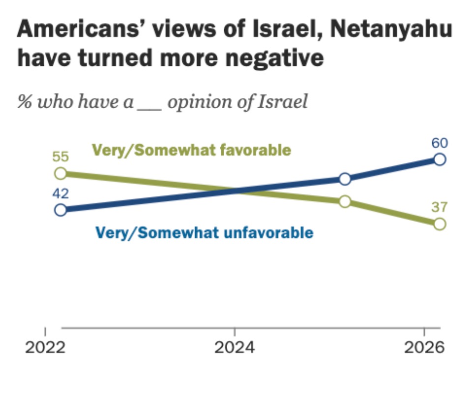 That share has grown considerably since 2022, before Israel began its US-backed war on the population of Gaza in retaliation for a Hamas-led attack. That year, just 42% in the US viewed Israel unfavorably.
