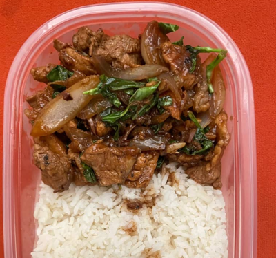 Primero calientas el aceite y le añades el ajo hasta que huela bien, después añades la sal, azúcar y el chile si quieres. Después añades el pollo con salsa de soya oscura y demás salsas, si tienes, y cuando está casi cocinado le incorporas la cebolla y al final, la albahaca. Se sirve con arroz blanco.