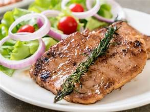 Cuatro bistecs de cerdo, 2 cucharadas de aceite, 1 cucharada de maicena, 1 taza de maní, 2 cucharadas de crema de leche, 2 naranjas agrias, 1 cucharadita de azúcar blanca, 6 dientes de ajo, 1 cucharadita de comino, agua, sal a gusto.