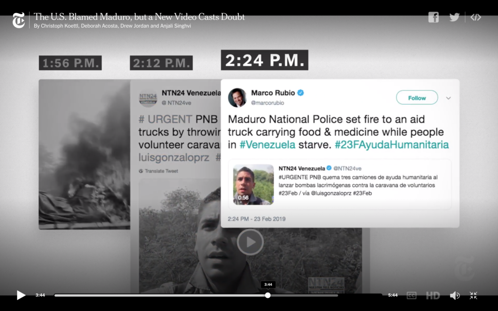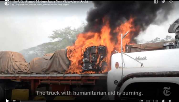 Footage contradicts U.S. claim that Maduro burned aid convoy (Video) By The New York Times On Mar 10, 2019 Share FacebookTwitterEmailGoogle+ReddItWhatsAppPinterest Marco Rubio in his usual role: lying. Post Views: 182 Share FacebookTwitterEmailGoogle+ReddItWhatsAppPinterest