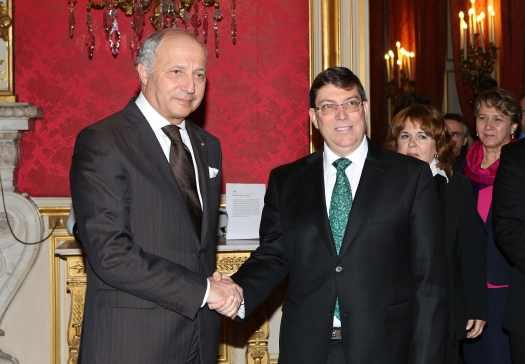 [Photo taken on Friday, March 14, of Laurent Fabius (left) and Cuban Foreign Minister Bruno Rodríguez Parrilla.]