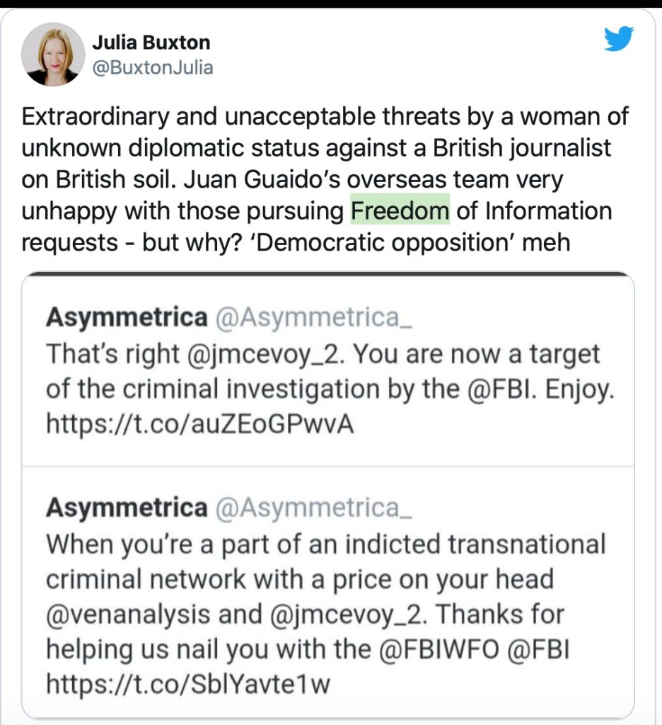The accusations made against myself and other journalists by Asymmetrica, owned by Juan Guaidó’s UK representative Vanessa Neumann, are at once serious and laughable. Without basis, Neumann has accused various journalists of forming part of a ‘transnational crime network’ and ‘hacking’ her Twitter account, adding that there is a ‘price on your head’. This is no way for anybody, let alone a ‘diplomat’, to behave – and the Foreign and Commonwealth Office should now seriously reconsider its recognition of her in the UK.”