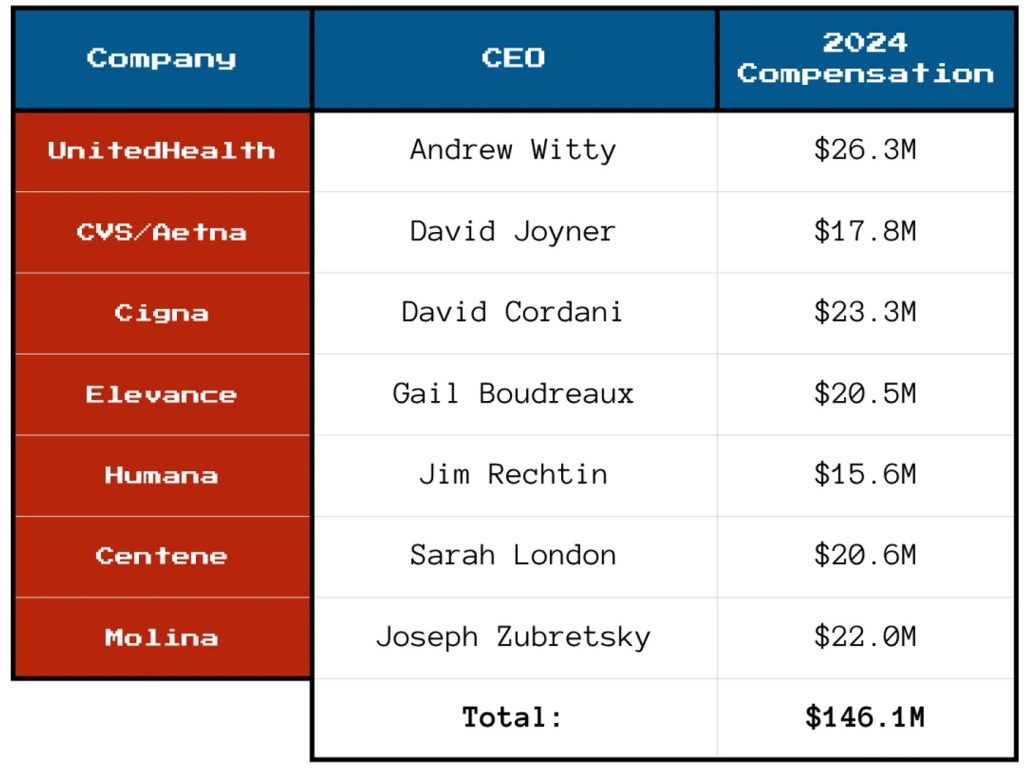 Alongside a chart detailing the companies’ 2023 and 2024 revenues and profits, Potter published one showing each CEO’s compensation. He also pointed out that their collective take-home pay is “enough to cover annual premiums for thousands of American families.”