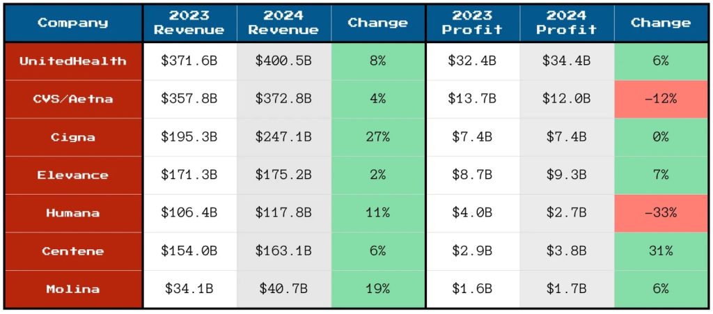 As Potter detailed for his newsletter, Health Care un-covered, the companies—UnitedHealth, CVS/Aetna, Cigna, Elevance, Humana, Centene, and Molina—boosted their profits by more than half a billion dollars from 2023 to 2024.