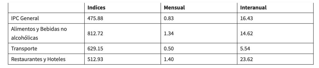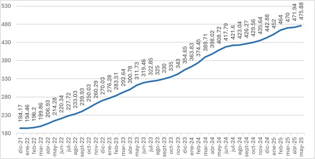 Although a slowdown trend has continued since 2024, there is resistance to its reduction. The inflation rate is around 16.43%. This does not mean that prices are falling; rather, they are still rising, albeit at a slower pace. Thus, in May 2025, the Consumer Price Index stood at 475.88 compared to the 2010 base year, with a year-over-year change of 16.43%, as shown in the following table.