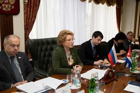 [Photo at top of Valentina Matviyenko, president of the Russian Senate, at meeting with Ricardo Cabrisas. At left is Ilyas Umakhanov, her deputy.]