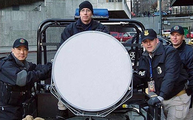 [Photo at top of a ‘sound cannon’ developed by the LRAD Corporation in San Diego (Calif.) to stun and disorient demonstrators.]