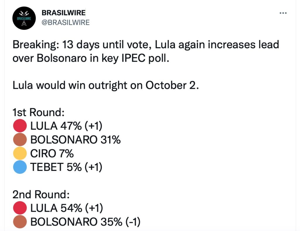 Brazilian pollster IPEC’s latest survey shows da Silva leading Bolsonaro 47% to 31% in the first-round contest, which will take place on October 2. That’s a one-point boost from the previous week’s polling.