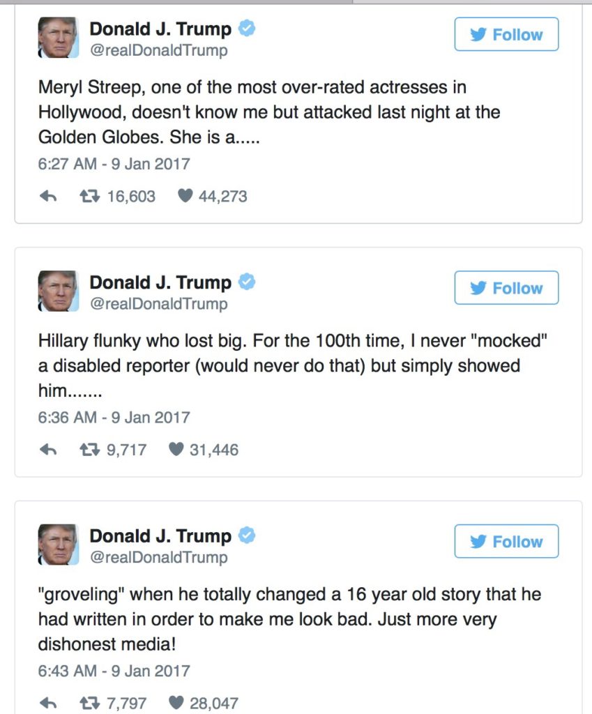 Meryl Streep destroys Trump at Golden Globes; he retorts with Twitter rant & lie