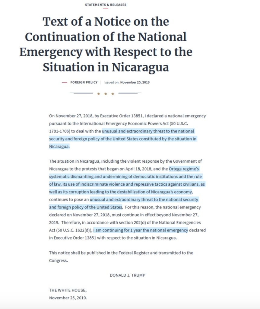 On November 25, the Trump White House then quietly issued a statement characterizing Nicaragua as an “unusual and extraordinary threat to the national security and foreign policy of the United States.”