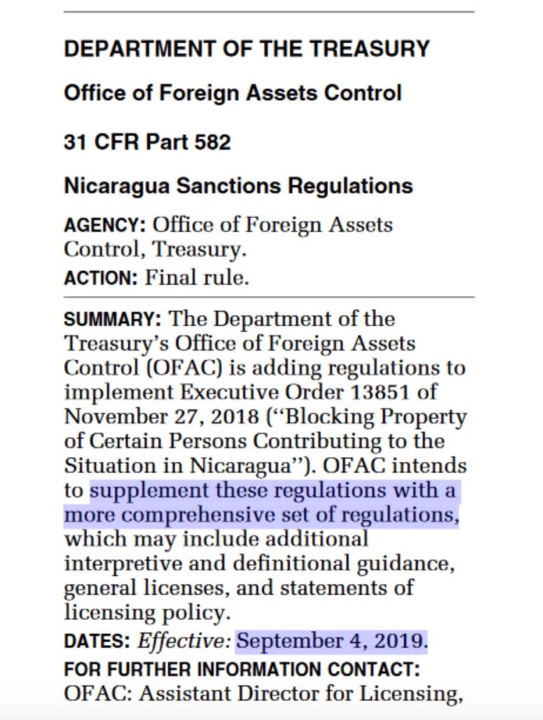 This is not just rhetoric. The US Department of the Treasury updated the Nicaragua-related sanctions section of its website as recently as November 8.
