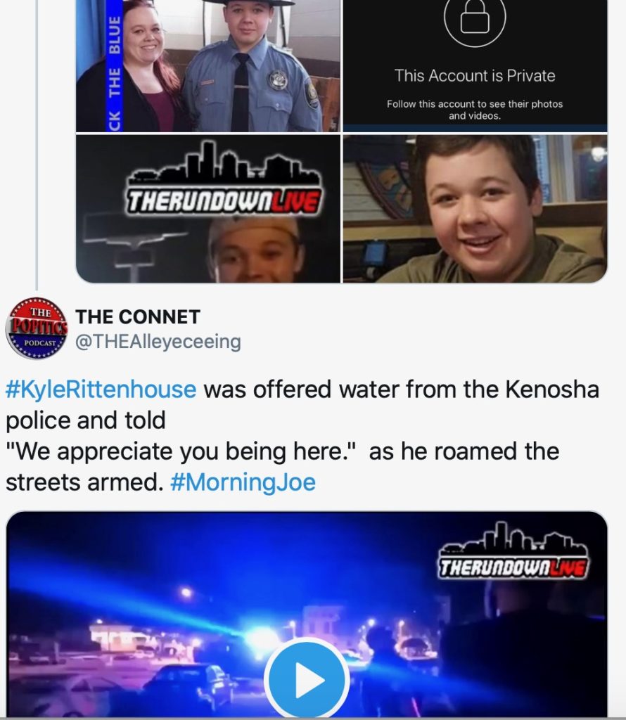 Another video shows them fraternizing with heavily militarized police, who offer them water and tell him “we appreciate you guys, we really do,” evidence which might explain why he was neither shot nor even arrested after killing two people right in front of dozens of law enforcement officers.
