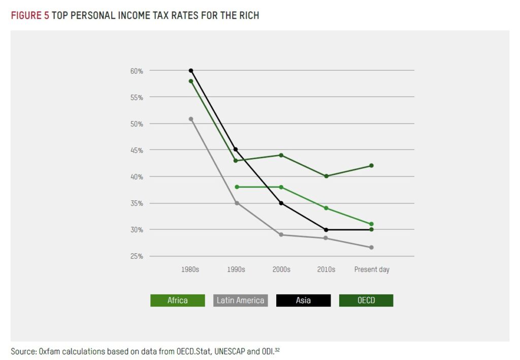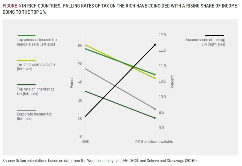 Oxfam argues that one of the main reasons for this breath-taking increase in inequality is a big decline in taxation.