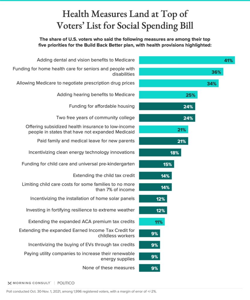 On Tuesday, HuffPost‘s Igor Bobic tweeted that he saw Sanders showing Senate Democrats the Morning Consult/Politico survey, which found that 41% of U.S. voters see adding dental and vision to Medicare as their number one hope for the Build Back Better Act.