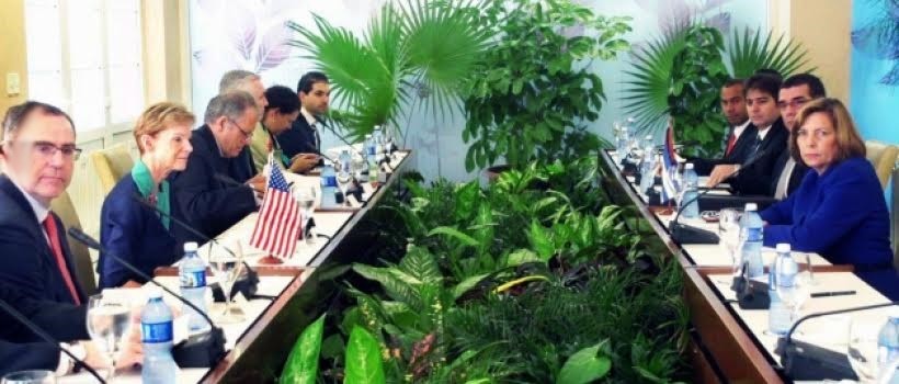 Photo at top: The U.S. delegation was headed by, from left, John S. Creamer, deputy acting Secretary of State; Kristie Kenney, State Department Counselor; and Jeffrey DeLaurentis, U.S. chargé d’affaires. The Cuban delegation was headed by, from right, Josefina Vidal, director of the Foreign Ministry’s U.S. Division; José Ramón Cabañas, Cuban Ambassador to the U.S.; and Abel González Santamaría, advisor on Defense and National Security.