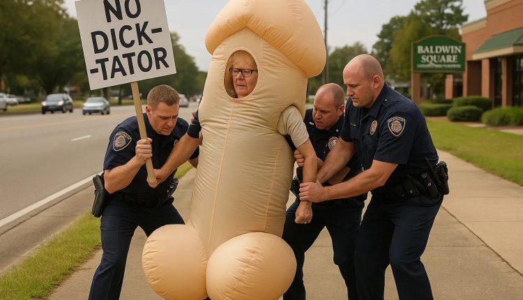 Witnesses describe the scene as something between a Fellini film and a civics lesson gone horribly right. It took three muscular police officers, armed with mortal shame and clipboards, to prevent 61-year-old Jeana Renea Gamble, who was peacefully standing by the Baldwin Square Shopping Center dressed as a colossal inflatable penis, from protesting tyranny under the banner of “No Kings.” Her sign read “No Dick-tator,” which, according to police reports, was “both accurate and deeply uncomfortable to explain at dinner.”