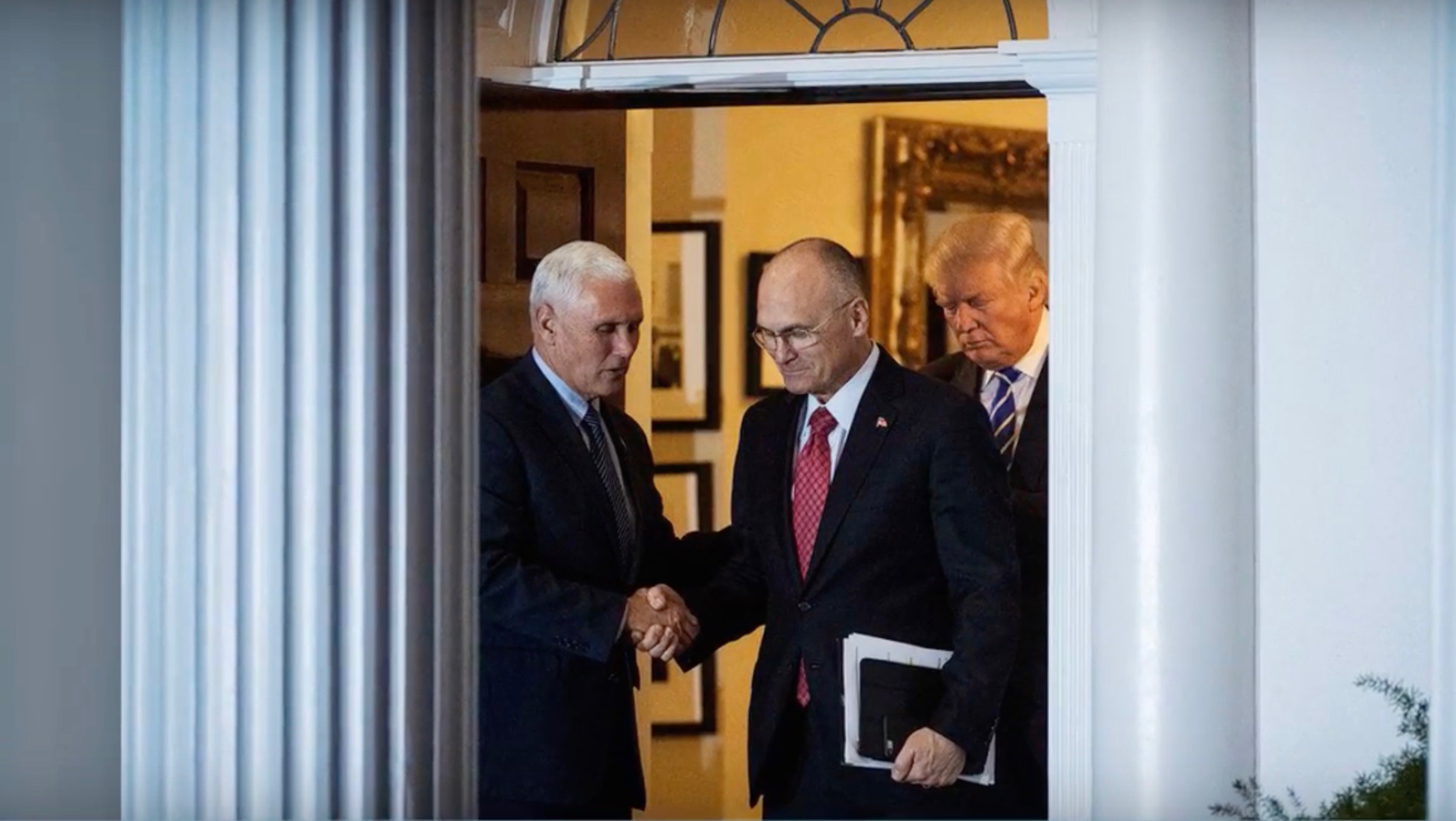 [In photo at top is vice president-elect Mike Pence shaking hands with Andrew Puzder. In the background is Trump.]