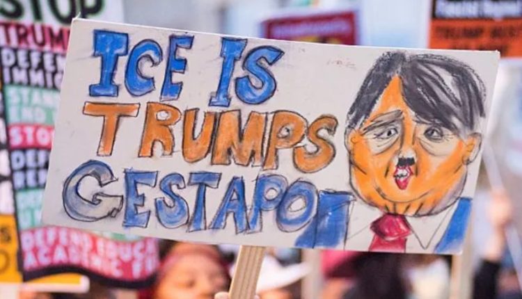 Signs at the rally read, “ICE Is Trump’s Gestapo,” “Stop ripping families apart,” and “They blame immigrants so you won’t blame billionaires.”
