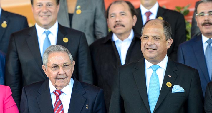 Cuban President Raúl Castro, left, and Costa Rican President Luis Guillermo Solís pose for a picture at the third annual summit of the Community of Latin American and Caribbean States (CELAC). Behind them stands Nicaraguan President Daniel Ortega, with whom Solís had a verbal flare-up during the summit / Alberto Font/The Tico Times.