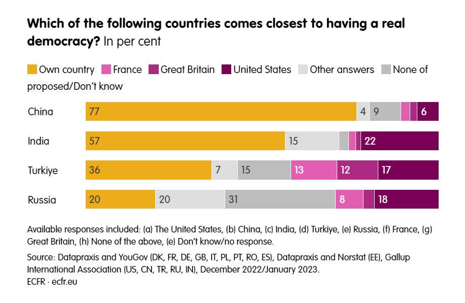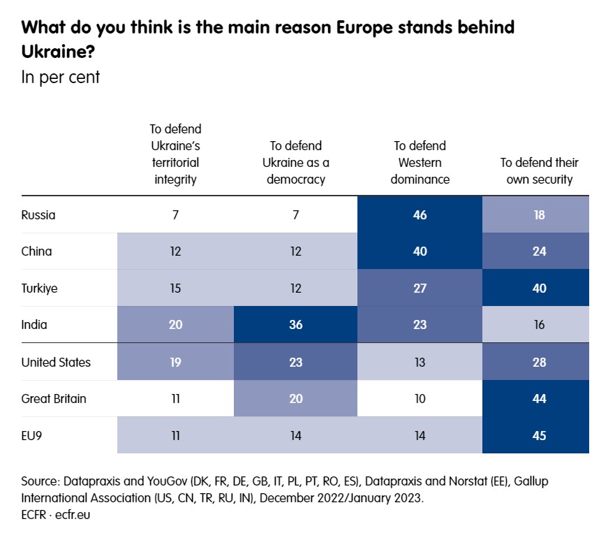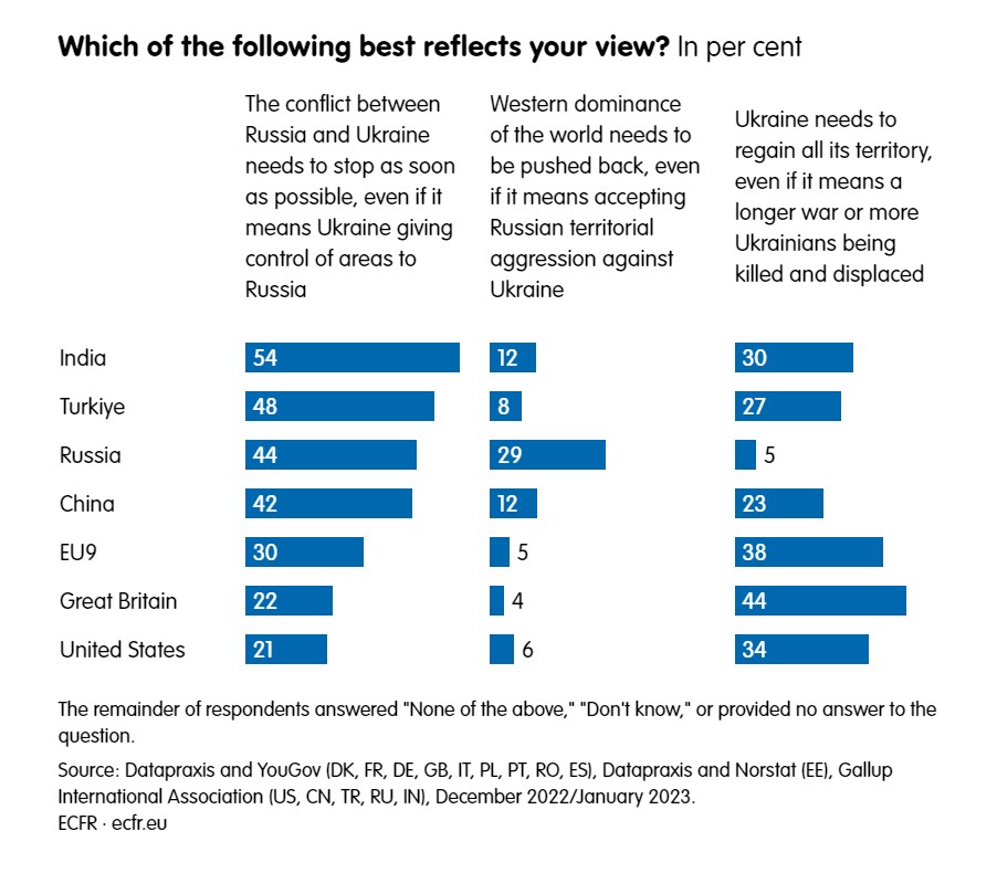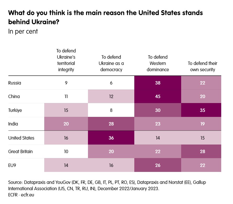 Forty percent of people surveyed in China, 46% in Russia, 27% in Türkiye, and 23% in India said Europe is supporting Ukraine in order “to defend Western dominance.”
