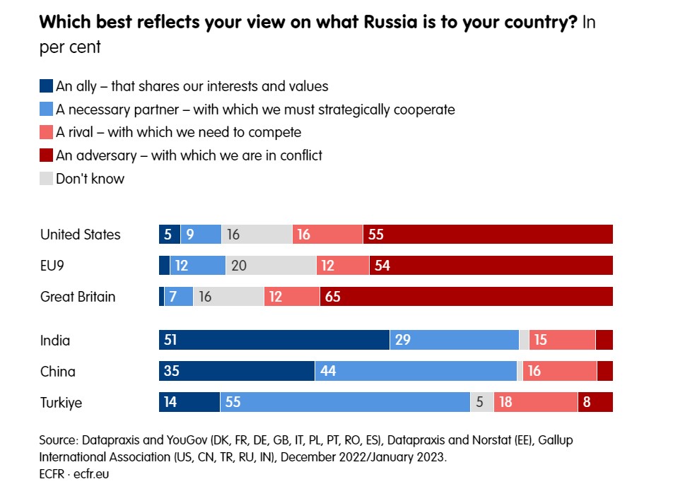 While a majority of people in the United States, Britain, and EU consider Russia to be an “adversary with which we are in conflict,” the situation is the opposite in India, China, and Türkiye.