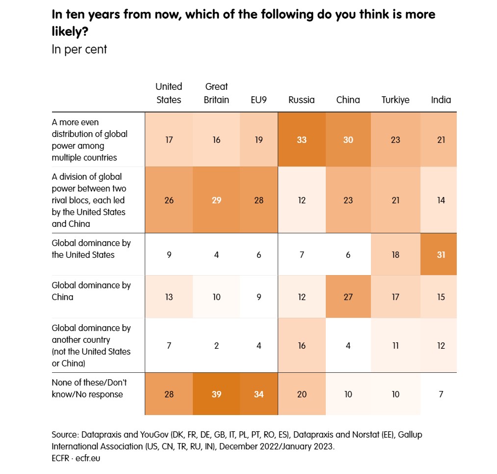 This is in stark contrast to the plurality of those surveyed in Britain (29%), the EU (28%), and the US (26%), who see the world returning to a bipolar system of cold war competition between a US-led bloc and a China-led bloc.